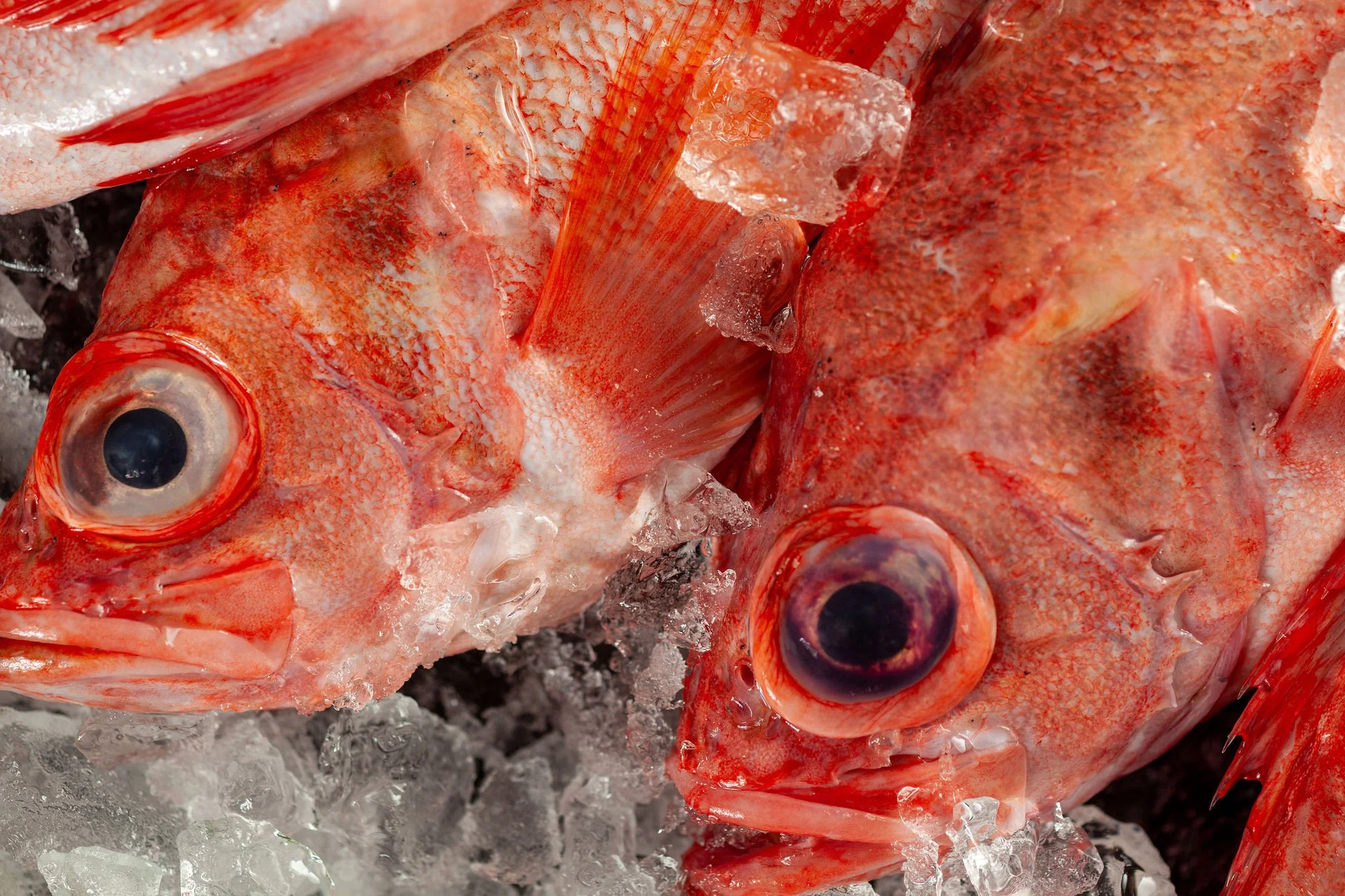 Acadian redfish goes by many names—Atlantic redfish, ocean perch, and occasionally “golden redfish” in other markets. Scientific name aside, you’ll recognize it by its bright orange-red body, pale underside, large eyes and long dorsal fin.
